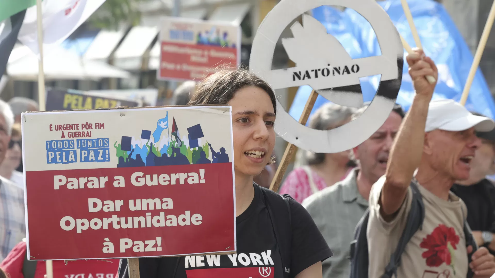 Dezenas de pessoas se reuniram hoje em Lisboa para protestar contra a “corrida ao armamento”, em um ato convocado pela central sindical CGTP e pelo Conselho Português para a Paz e Cooperação. O protesto ocorreu no mesmo dia em que teve início a Cimeira da NATO em Haia, na Holanda.